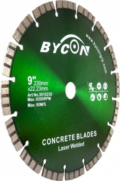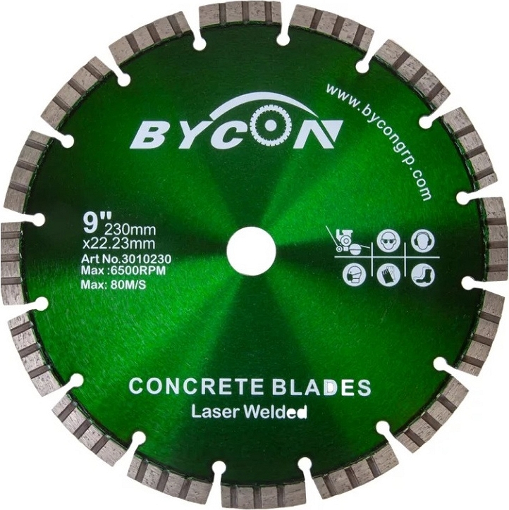Алмазный диск Bycon Laser Turbo 230 мм (Байкон Лазер Турбо 230 мм) применяется, как правило, на угловых шлифовальных машинах (болгарках), а также на камнерезных станках и плиткорезах электрических. Обрабатываемые материалы: бетон, армированный высокопрочный железобетон, гранит, природный камень, бордюрный камень, твердый песчанник, твердая тротуарная плитка, клинкерный кирпич (клинкер) и другие материалы.
