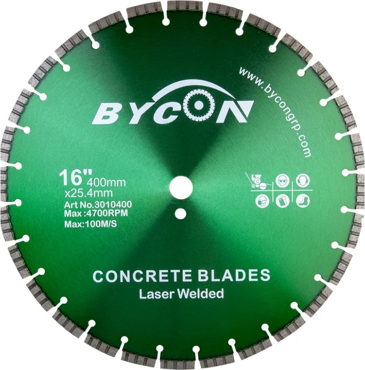 Алмазный диск Bycon Laser Turbo 400 мм (Байкон Лазер Турбо 400 мм) применяется, как правило, на камнерезных станках, бензорезах (Stihl (Штиль), Husqvarna (Хускварна), Makita (Макита), Messer (Мессер), Wacker Neuson, Solo, Echo и других), электрических резчиках и малых швонарезчиках (Masalta, Grost, Калибр, Зубр, Сплитстоун, Diam и других). Обрабатываемые материалы: бетон, армированный высокопрочный железобетон, гранит, природный камень, бордюрный камень, твердый песчанник, твердая тротуарная плитка, клинкерный кирпич (клинкер) и другие материалы.