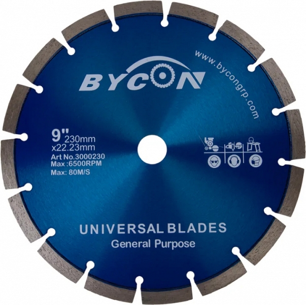 Алмазный диск Bycon Laser Uni 230 мм (Байкон Лазер Уни 230 мм) применяется, как правило, на угловых шлифовальных машинах (ушм, болгарках), штроборезах, бензорезах, электрических резчиках, стенорезных машинах и плиткорезах электрических. Обрабатываемые материалы: бетон, армированный железобетон, гранит, природный камень, клинкерный кирпич (клинкер) и другие материалы.