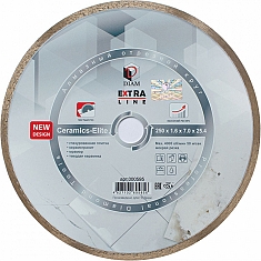 Алмазный отрезной круг Diam Extra Line 1A1R Корона Ceramics-Elite 250 мм (Диам Экстра Лайн 1А1Р Корона Керамикс-Элит 250 мм) – специальный алмазный круг со сплошной режущей кромкой для мокрой резки глазурованной плитки, твердой керамики, керамогранита, мрамора и аналогичных по своим характеристикам материалов на бензорезах, электрических резчиках и плиткорезах, камнерезных станках, стенорезных машинах с подачей воды.