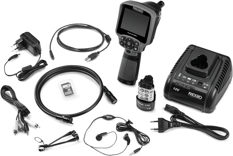 Камера для видеодиагностики с Wi-Fi и Bluetooth Ridgid micro CA-350x (Риджид микро ЦА-350х) – технический промышленный гибкий эндоскоп с подсветкой для мгновенного обмена фотографиями и видеороликами и просмотра в режиме реального времени на втором мониторе! Улучшенный литий-ионный аккумулятор 2,5 А/ч, 12 В и зарядное устройство обеспечивают длительную эксплуатацию и быструю зарядку. Легко записывает фото- и видеоматериалы о проблемах в труднодоступных местах и сохраняет эти материалы во внутренней памяти (235 МБ) или на прилагаемой SD-карте емкостью 8 ГБ. Удобная «пистолетная» рукоять, большой экран и прочная головка камеры из анодированного алюминия с 4-мя яркими светодиодами упрощают обнаружение и диагностику недосягаемых объектов. Идеальное изображение с использованием дополнительных функций, таких, как поворот изображения и цифровое масштабирование. Кроме ионно-литиевого аккумулятора на 3,7 В, питание может осуществляться и через прилагаемый адаптер переменного тока – идеально подходящего для продолжительной видеодиагностики трубопроводов и в случае разряда аккумулятора.