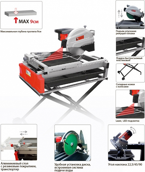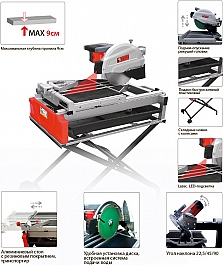 Камнерезный станок Diam Proline PLK 250/1.8 (Диам Пролайн ПЛК 250/1.8) предназначен для резки плитки, керамогранита, кирпича и других строительных и отделочных материалов и заготовок длиной до 610 мм, толщиной до 90 мм, под разными углами.