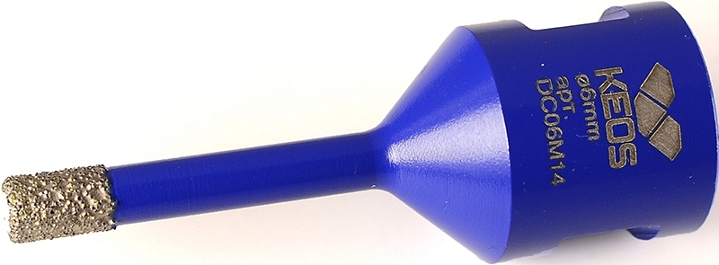 Коронка алмазная по керамограниту Keos Professional Vacuum Brazed M14 6 мм (Кеос Профессионал Вакуум Брейзед М14 6 мм) – корончатое сверло для сверления отверстий Ø 6 мм в керамической плитке, керамограните, граните, мраморе и других видах камня, как на сухую, так и с охлаждающими жидкостями, с использованием сетевых электрических и аккумуляторных УШМ.