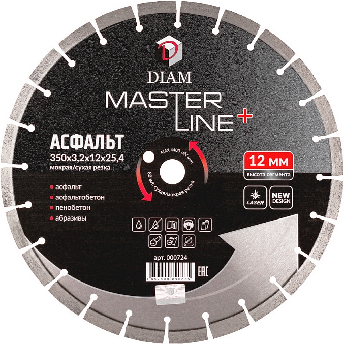 Круг алмазный сегментный Diam Master Line+ 1A1RSS Асфальт 350 мм (Диам Мастер Лайн+ 1А1РСС Асфальт 350 мм) – профессиональный алмазный отрезной диск для сухой и мокрой резки асфальта, асфальтобетона, пенобетона, свежего бетона, кирпича, а также других абразивов на резчиках швов, стенорезных машинах, камнерезных станках, электрических резчиках, бензорезах, как с подачей воды, так и без нее.