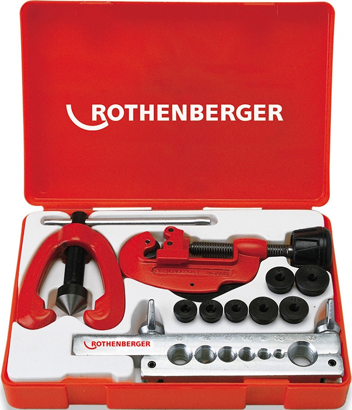 Модель снята с производства! Набор для резки и развальцовки труб Rothenberger DB 3/16"-1/4"-5/16"-3/8"-7/16"-1/2"-5/8" (Ротенбергер ДБ 3/16"-1/4"-5/16"-3/8"-7/16"-1/2"-5/8") предназначен для резки труб Ø 3 – 30 мм (1/8" – 1 1/8"), толщиной стенки до 3 мм и развальцовки (получения качественных и точных простых одинарных и двойных бортиков под углом 45°) труб Ø 3/16", 1/4", 5/16", 3/8", 7/16", 1/2", 5/8", толщиной стенки до 1 мм, из меди, латуни, алюминия и тонкостенной стали, при монтаже и ремонте систем кондиционирования, в автомобилестроении для развальцовки тормозных трубок.