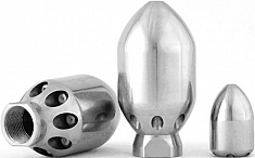 - Изготовлены из особо износостойкой, не поддающейся коррозионному воздействию, закаленной, нержавеющей стали с использованием оптимизированной системы "3D Гидромеханикс": насадки для очистки канализационных сетей были разработаны с использованием оптимизированного "3D Гидромеханизма" – вода, выходящая из шланга высокого давления, плавно поворачивается на 180º, поступает во внутреннюю полость насадки и направляется непосредственно в керамические сопла по пяти осевым каналам (отшлифованных и с высокой точностью обработанных на станке типа CNC), а не трубок или желобов