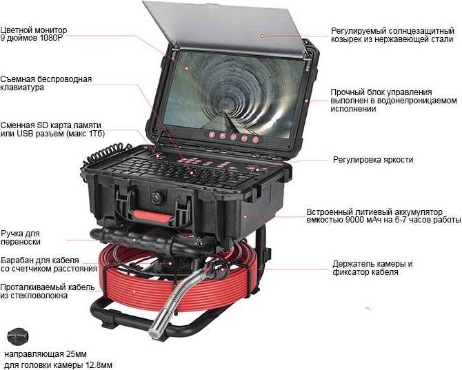 - Головка камеры Ø 12,8 × 21 мм и проталкиваемый кабель Ø 4,8 мм × 30 м из стекловолокна со счетчиком длины, подходящие для труб Ø 32 – 65 мм, длиной до 30 м