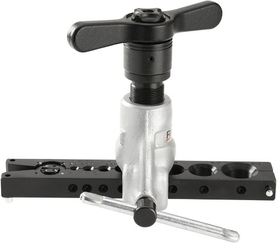 Развальцовка с храповым механизмом Ridgid 458R (Риджид 458Р) – высокоточный инструмент с трещоточным механизмом для развальцовки, эксцентриковый развальцовщик с трещоткой для развальцовки под углом 45° (создания SAE-раструбов 45°) алюминиевых, отожженных медных, стальных, нержавеющих стальных, твердых медных, латунных труб Ø 1/8", 3/16", 1/4", 5/16", 3/8", 1/2", 5/8", 3/4", толщиной стенки до 0,9 мм (0,035").