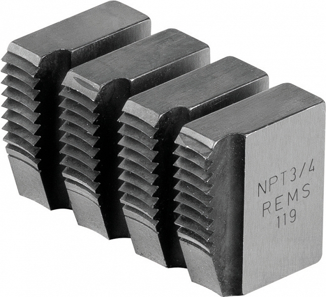 Резьбонарезные плашки Rems NPT 3/4" (Ремс НПТ 3/4") предназначены для нарезки правой трубной конической резьбы NPT (Taper Pipe Thread ASME B1.20.1) на стальных трубах Ø 3/4" с применением ручных и электрических резьбонарезных трубных клуппов Ева, Амиго, Амиго 2, Амиго 2 Компакт.
