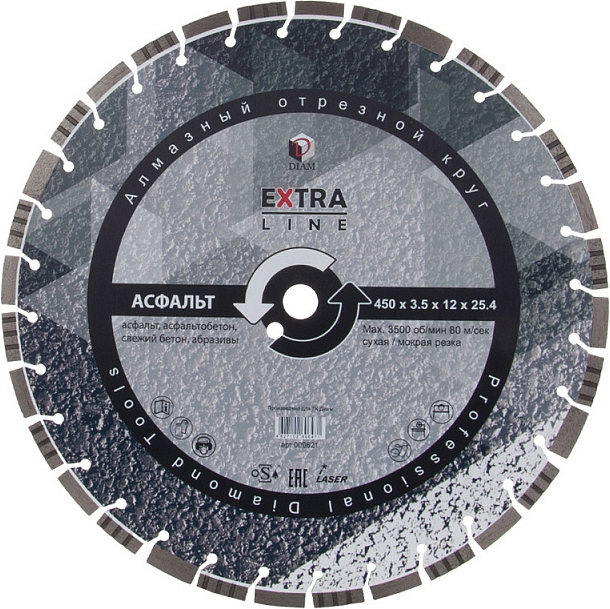 Сегментный алмазный круг Diam Extra Line 1A1RSS Turbo Асфальт 450 мм (Диам Экстра Лайн 1А1РСС Турбо Асфальт 450 мм) – профессиональный алмазный отрезной диск с лазерной сваркой сегментов для сухой и мокрой резки асфальта, асфальтобетона, свежего бетона, пенобетона, абразивного песчаника, шамотного и силикатного кирпича, шамота и других абразивов на резчиках швов, стенорезных машинах, камнерезных станках, как с подачей воды, так и без нее.