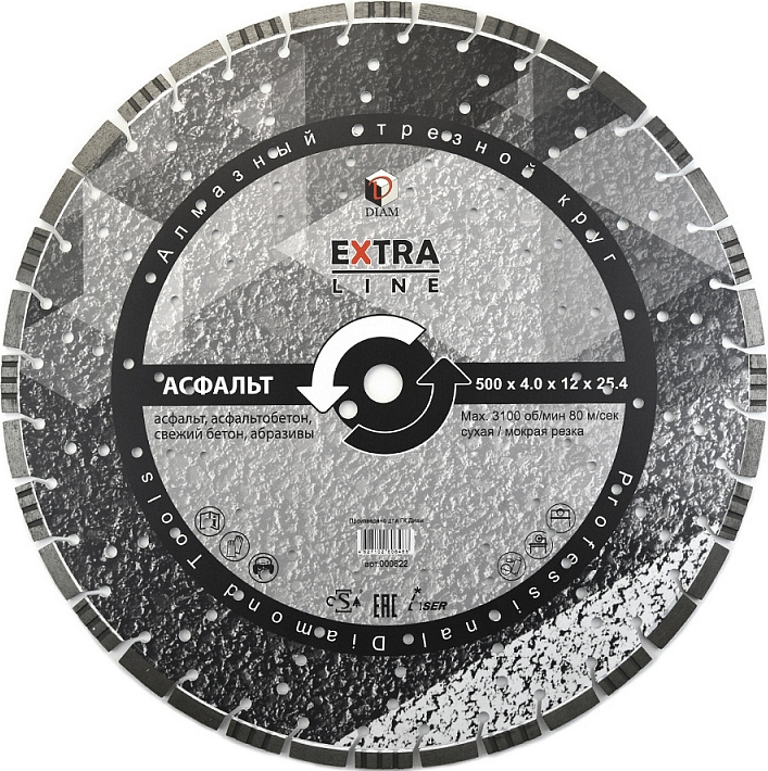 Сегментный алмазный круг Diam Extra Line 1A1RSS Turbo Асфальт 500 мм (Диам Экстра Лайн 1А1РСС Турбо Асфальт 500 мм) – профессиональный алмазный отрезной диск с лазерной сваркой сегментов для сухой и мокрой резки асфальта, асфальтобетона, свежего бетона, пенобетона, абразивного песчаника, шамотного и силикатного кирпича, шамота и других абразивов на резчиках швов, стенорезных машинах, камнерезных станках, как с подачей воды, так и без нее.