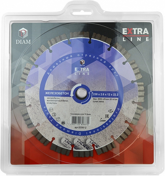 Сегментный алмазный круг Diam Extra Line 1A1RSS Turbo Железобетон 230 мм (Диам Экстра Лайн 1А1РСС Турбо Железобетон 230 мм) – профессиональный алмазный отрезной диск с лазерной сваркой сегментов для сухой резки железобетона, старого высокопрочного бетона, клинкера, огнеупоров и других твердых материалов на болгарках (ушм), штроборезах, бензорезах, электрических резчиках и плиткорезах, ручных стенорезных машинах, без водяного охлаждения.