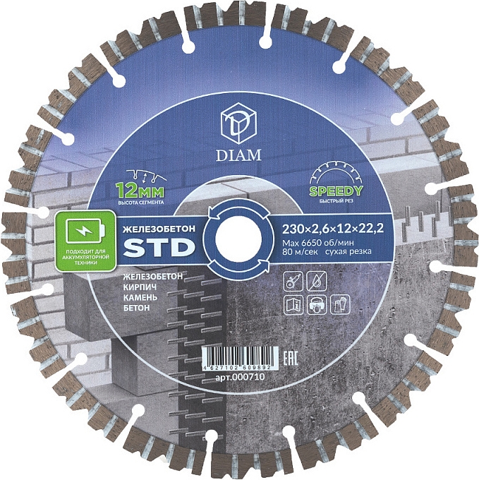 Сегментный алмазный круг Diam STD 1A1RSS Turbo Железобетон 230 мм (Диам СТД 1А1РСС Турбо Железобетон 230 мм) – профессиональный алмазный отрезной диск для сухой резки железобетона, бетона, камня, кирпича на ручном электроинструменте без водяного охлаждения, в том числе на аккумуляторной технике и плиткорезах электрических.