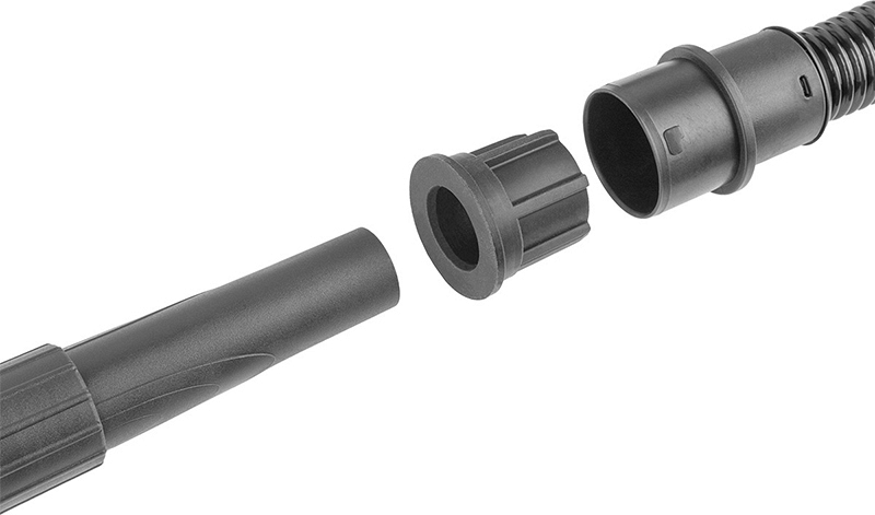 - В комплектацию входят два шланга 3 + 1,5 м, можно использовать по отдельности, можно соединить вместе: такая конструкция позволяет собирать пыль на большом расстоянии, например, под потолком, при этом не требуется поднимать пылесос
