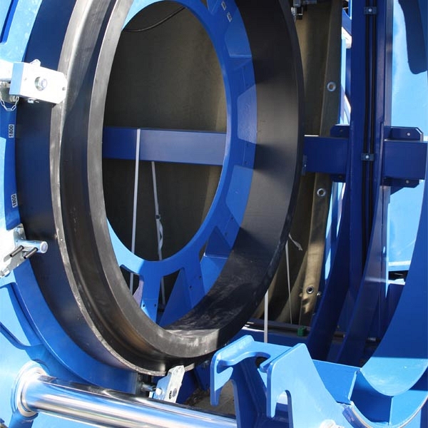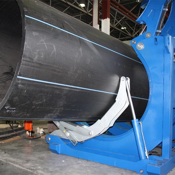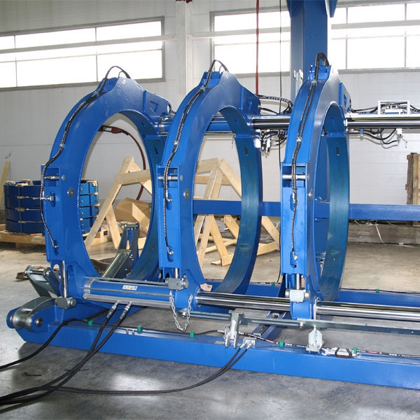 - Усовершенствованная модель гидравлической машины для стыковой сварки полиэтиленовых труб Uponor Infra PT 1600. Отличия заключаются в том, что хомуты центратора открываются и закрываются с помощью первого гидравлического привода, а в закрытом положении второй гидравлический привод их запирает, создавая необходимое усилие для испраления овальности трубы. Это намного удобнее, чем поднимать верхние половинки хомутов краном, а затем притягивать их гайками вручную. Кроме того, на обеих сторонах центратора установлены роликовые упоры для труб, высота которых также регулируется гидравлическим приводом.