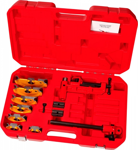 – Желтые стандартные сегменты: Ø труб 10 – 22 мм, толщина стенки труб 1 - 1,5 мм, угол изгиба 0° – 180°, малый радиус изгиба - Дополнительная принадлежность для крепления на верстаке: опорное основание, в которое устанавливается трубогиб, экономит место и позволяет работать в горизонтальном и вертикальном положении, хранится в чемодане для трубогиба