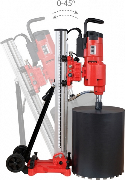 Установка для алмазного бурения Diam ML-350/2AEDC (Диам МЛ-350/2АЕДЦ) – мощная двухскоростная сверлильная машина с наклонной стойкой для сверления отверстий в бетоне и железобетоне Ø 20 – 300 мм, кирпичной кладке и других строительных материалах Ø 20 – 350 мм, под углом до 45°, с подачей воды.